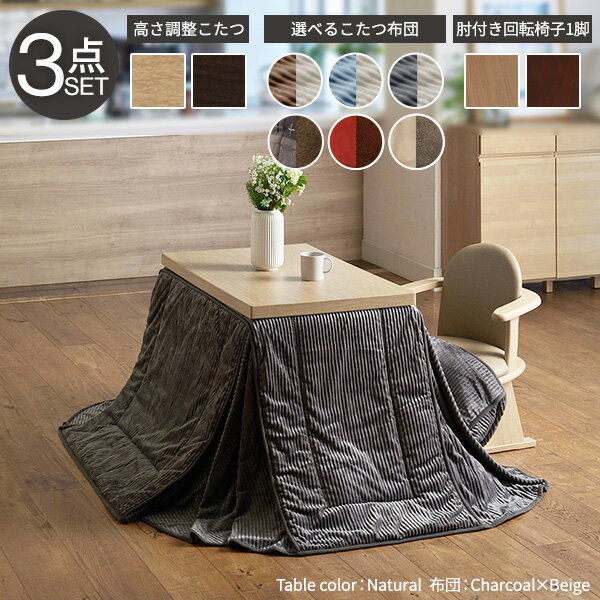 【セット構成】こたつ本体x1台/こたつ布団x1枚/肘付回転椅子x1台【布団バリエーション】しじら織り・レンガxブラウン・ベージュxグレー【仕様】■こたつ本体天板:繊維板(転写プリント) 脚部:天然木(ラバーウッド)薄型石英管ヒーター(510W・中間スイッチ式) コード長さ:約3m◎一部組立(脚部取付)■こたつ布団[しじら]表地:綿100% 裏地:アクリル100% 中綿:ポリエステル100%[レンガ・ベージュ]表地・裏地:ポリエステル100%(はっ水フランネル) 中綿:ポリエステル100%■回転椅子フレーム:天然木 (アカシア) 座面:合成皮革◎一部組立(脚部取付)【サイズ】■こたつ本体幅90x奥行60x高さ45/50/55/60/65/70cm(継ぎ脚10cmx2個 5cmx1個)・約17kg■こたつ布団[しじら]250x220cm・中綿約950g[レンガ・ベージュ]252x222cm・中綿約440g■肘付き回転椅子幅55x奥行53x高さ74(69)cm・約10kg株式会社ナカムラ(I-3300260)