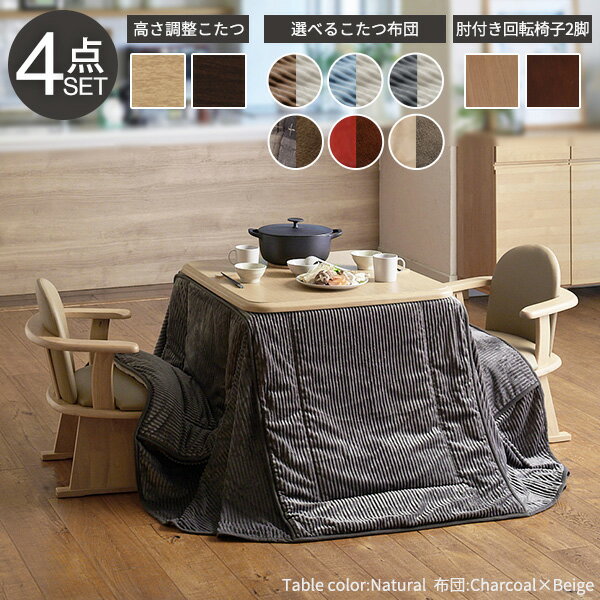 こたつ 正方形 ダイニングテーブル あったかヒーター-高さ調節機能付きダイニングこたつ〔アコード〕 80x80cm 4点セット(こたつ本体+専用省スペース布団+肘付き回転椅子2脚) ダイニングこたつ こたつ布団 ファン付き テレワーク リモートワーク ステイホーム