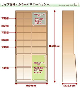 サイズ本体外寸:幅約90x奥行約29.5x高さ約 200 (cm)本体内寸:上段1スペース内寸:幅約 41.2x奥行き約15x高さ約38 (cm)本体内寸:下段1スペース内寸:幅約 41.2x奥行き約27.7x高さ約74 (cm)※可動棚上下合わせて8枚付き耐荷重:可動棚1枚あたり約8kg棚の厚さ:約1.8cm材質:パーチクルボード/MDF/プリント式化粧合板お客様組立商品です。